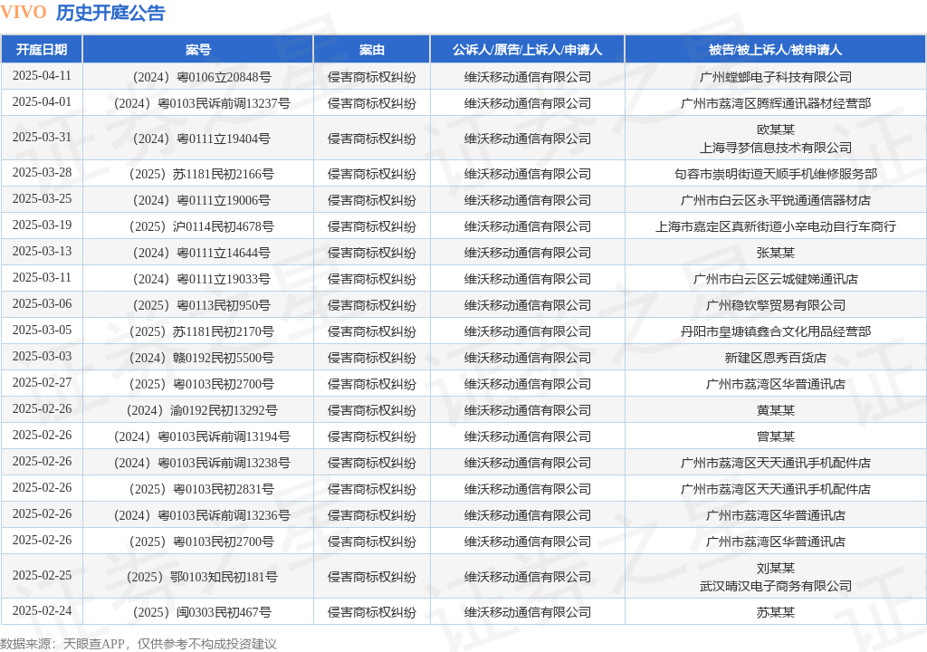 案号:(2024)浙0212民初17010号审理法院:宁波市鄞州区人民法院案由:侵害商标权纠纷当事人信息: 原告/上诉人:维沃移动通信有限公司 被告/被上诉人:象山天泞通讯器材店开庭日期:2025年2月19日根据统计,近一年内以维沃移动通信有限公司为当事人的历史开庭公告有332则,其中案由为“侵害商标权纠纷”的公告以307则居首,其次为“商标权权属、侵权纠纷”有7则,“产品责任纠纷”有3则。历史开庭公告(前20条)如下: